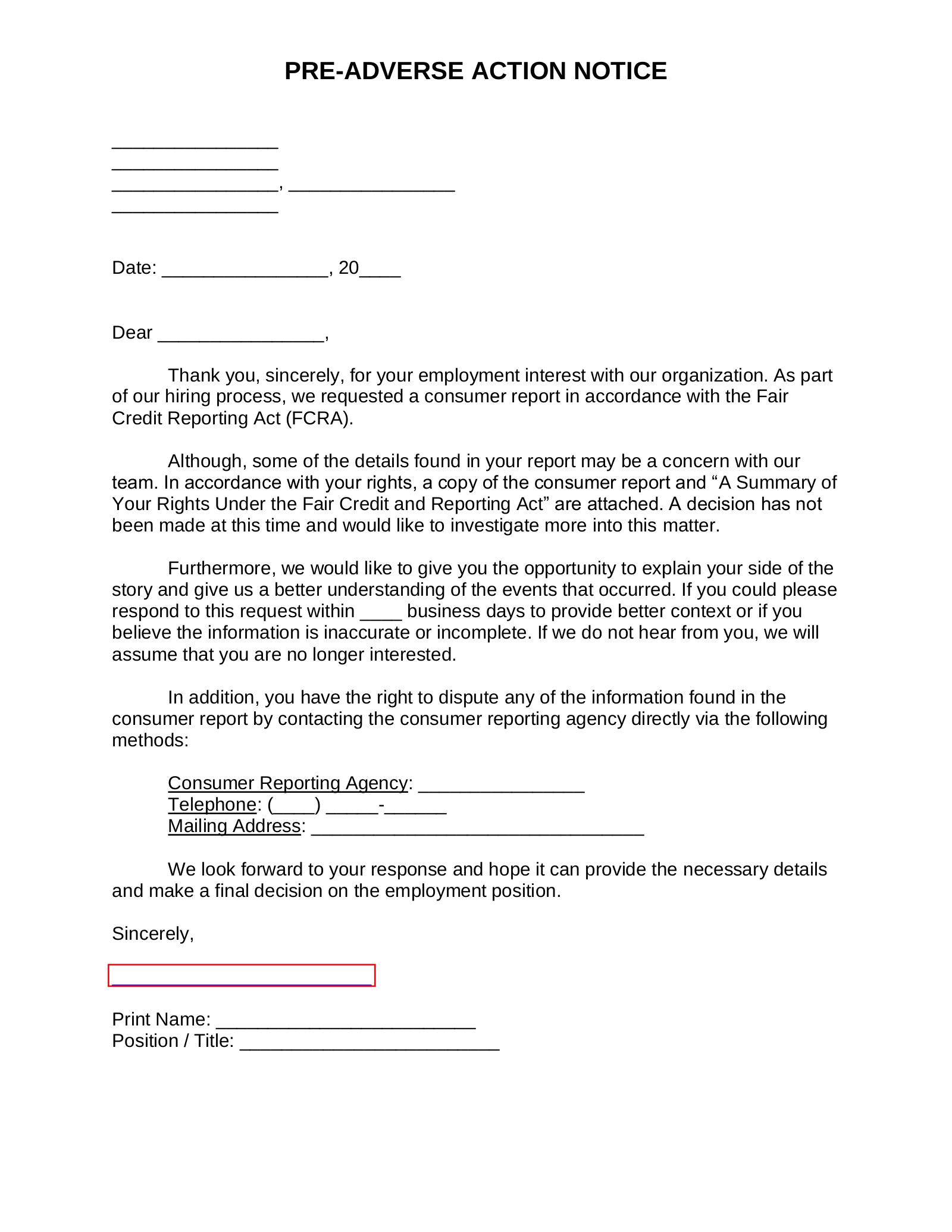 Having a reliable and customizable pre-adverse action notice template is a significant asset for any organization. It ensures consistency across all hiring decisions and streamlines a process that, if handled incorrectly, can become quite burdensome. A well-designed template allows your HR team to quickly and accurately generate the necessary documents, reducing the chance of errors that could lead to non-compliance. It serves as a foundational tool that can be adapted to specific situations while maintaining all the legally required elements.
